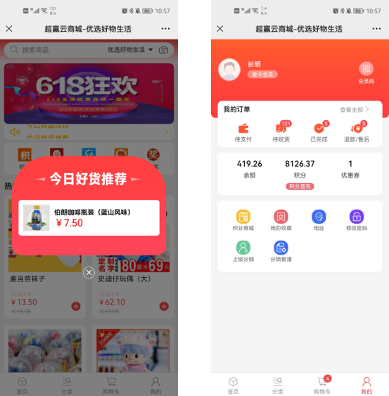 灵活的自定义模板,让商城更具唯一性与独特性,图片广告、橱窗展示、商品分类等多板块多风格自由搭配,轻松搭建个性商城店铺
